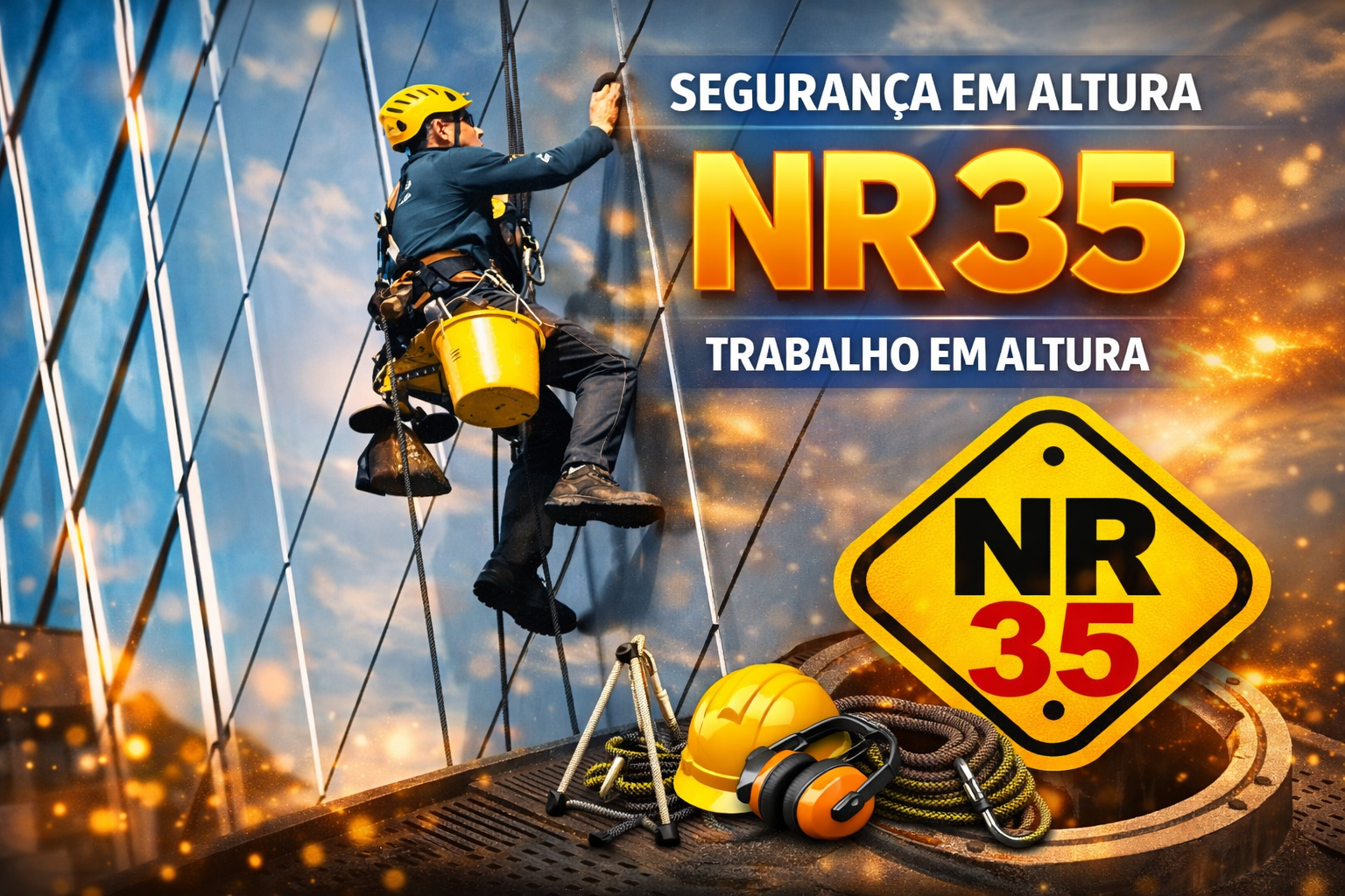 Segurança em Trabalho em Altura. Formação obrigatória para profissionais que trabalham acima de 2 metros. Aborda equipamentos de proteção, ancoragem e procedimentos de segurança.