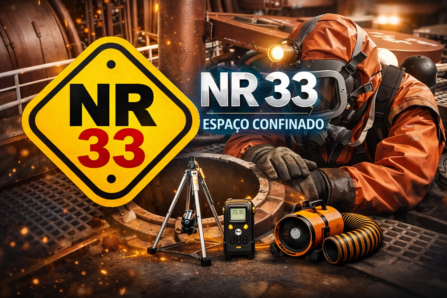 Segurança em Espaços Confinados. Capacitação para trabalhos em ambientes com risco de atmosfera perigosa. Inclui identificação de riscos, ventilação, monitoramento e resgate.