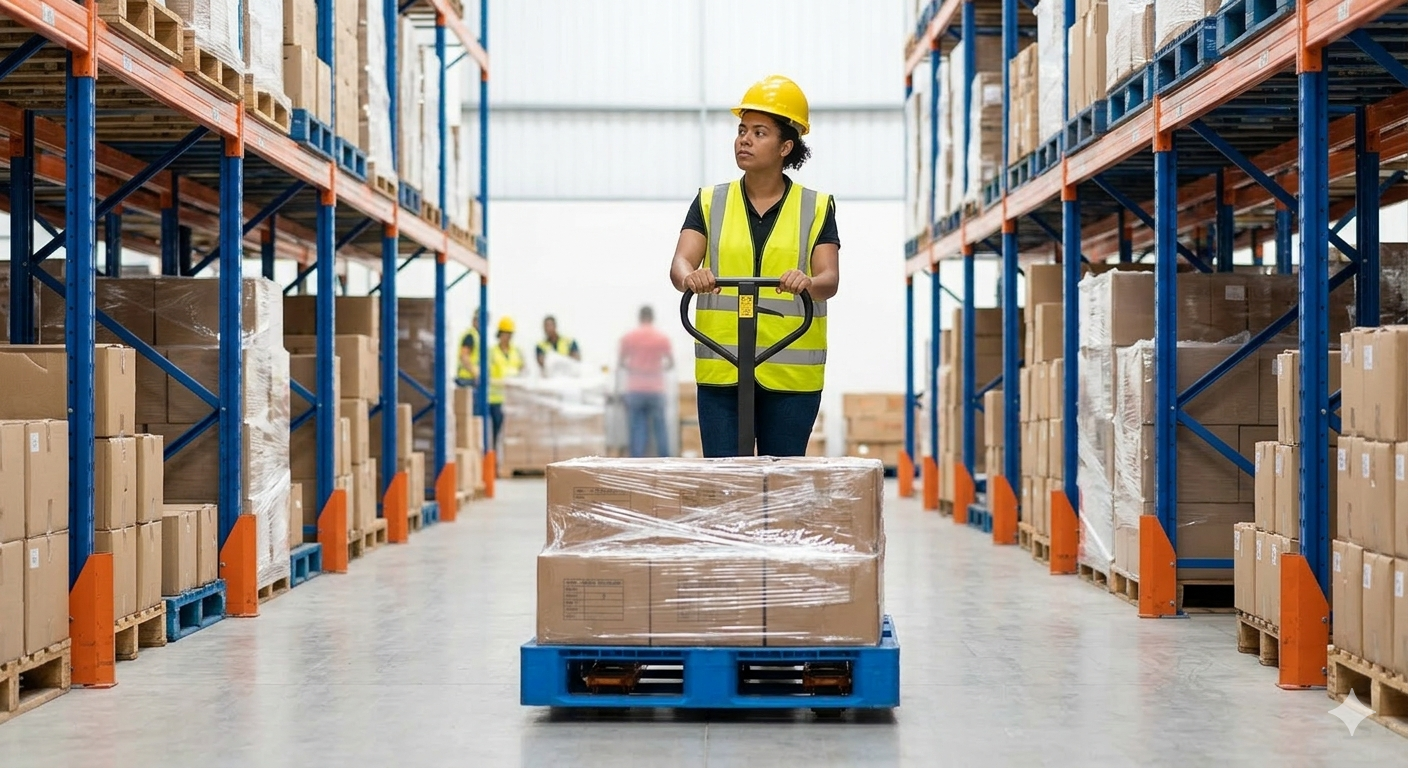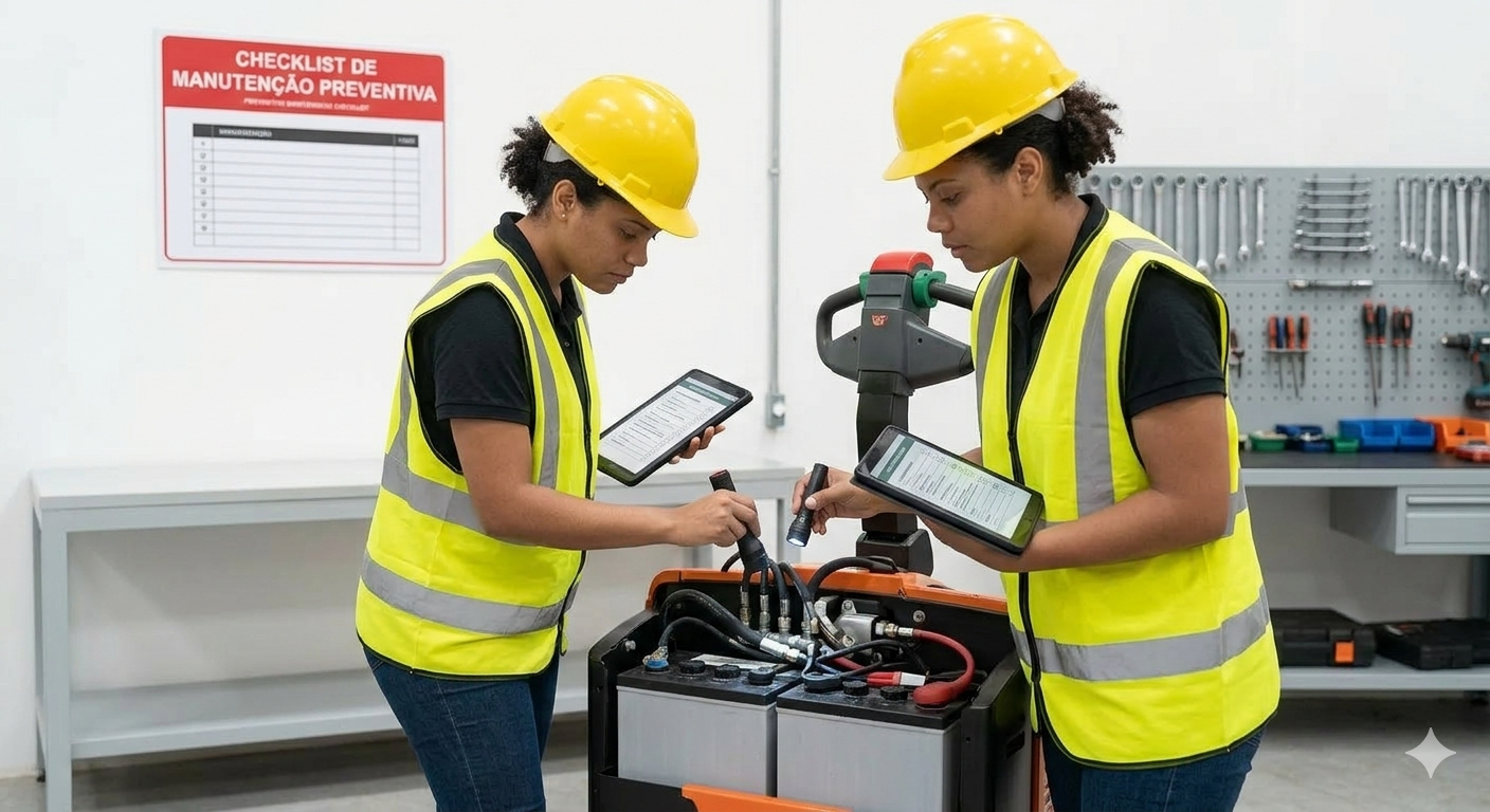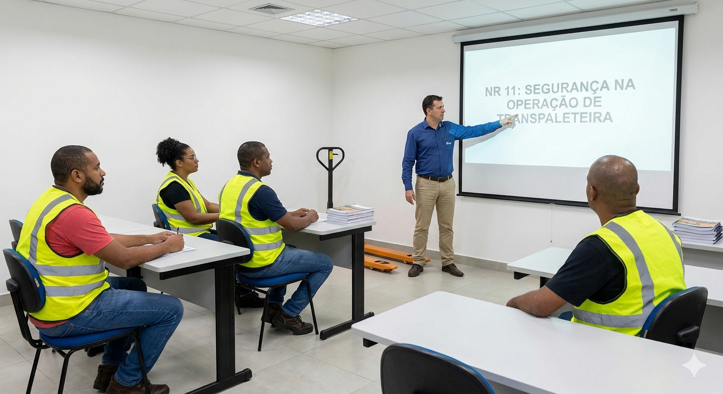 Operação de Transpaleteira Elétrica. Treinamento para operadores de transpaleteiras. Aborda segurança, inspeção diária, carga e descarga, e movimentação segura de materiais.